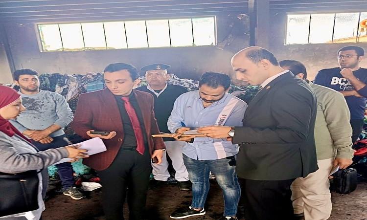 صور تعكس معاينة النيابة الإدارية بالمحلة الكبرى لموقع حريق مصنع النسيج