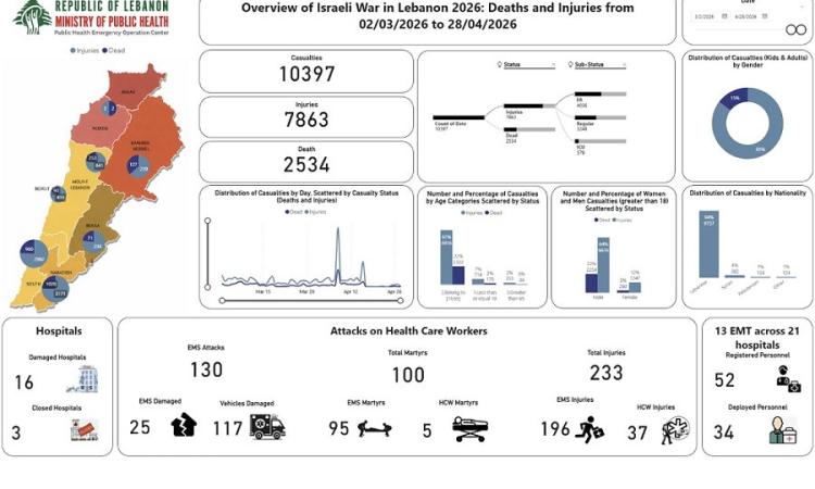 إحصائية مروعة في لبنان 2534 شهيدا و7863 جريحا جراء العدوان الإسرائيلي منذ 2 مارس